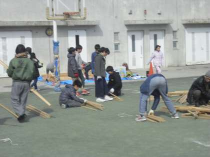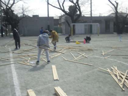 苦労して完成した8つの家による、八幡山小の校庭に現れた「まち」ですが、残念なことに解体しなければなりません。ここでも協力し、子どもたちは片付けの作業に入りました。少し名残惜しさもありましたが、みんなテキパキと働き、自分たちの作った家を解体していきました。製作から片付けまで、今日1日、6年生はみんな意欲的に取り組むことができ、充実した活動になりました。活動の最後に、今日ご協力いただいた講師の先生方や学生さんたちにお礼を述べました。