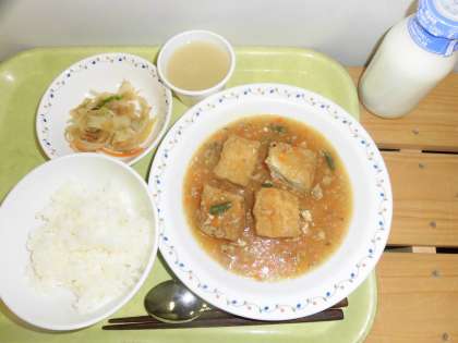 「ごはん、生揚げのそぼろあんかけ、野菜の辛子醤油、りんごゼリー、牛乳」です。