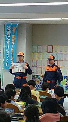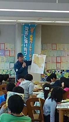 今日3年生は、八幡山町会の防犯部の尾崎さんと成城警察署の警備係の方2名に来ていただいて、「災害」について学びました。