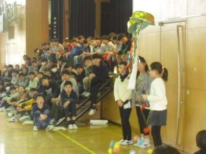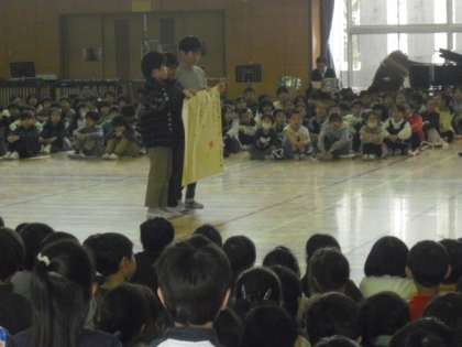 入場前は少しテンション高めだった6年生も、体育館に入ると、キッと表情が引き締まりました。はじめの言葉、プログラムの発表、校長先生の話、くす玉割りと続き、いよいよ各学年からの出し物です。