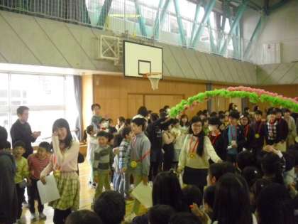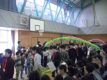 感動のうちに会は終了し、6年生が退場します。大きな拍手と歓声が上がり、6年生は、下級生全員に見送られて体育館を後にしました。送る側も送られる側も、しっかり自分たちの思いが伝えられていて、とてもすてきな会になりました。