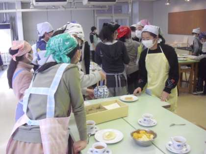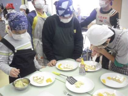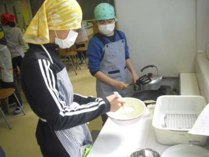 今日は6年生で家庭科の授業。1組も2組も、最後の調理実習です。グループで協力して、ホットケーキを作りました。メンバーで役割を決めて作業を分担し、手際よく進めていました。