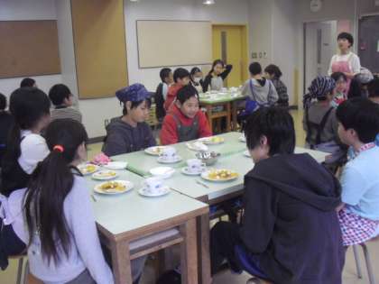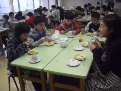 おいしく焼き上がり、デコレーションも上手にできました。全員そろっての会食では、みんなから笑顔がこぼれ、さらにおいしくいただけて、ほっぺたも落ちたようです。また一つ、小学校でのよい思い出ができました。