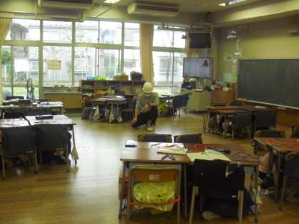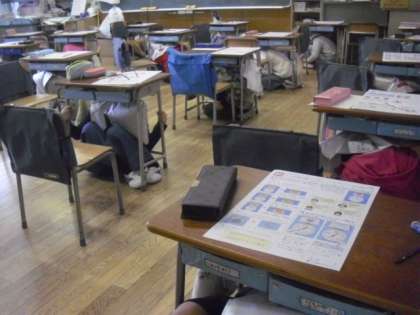 今年度も世田谷区では、平成23年3月11日に発生した東日本大震災及び、平成28年4月14日に発生した熊本地震などの記憶の風化を防ぐ目的で、区民が地震発生時にいち早く身の安全を確保できるよう、一斉の防災訓練を午前9時30分に行います。八幡山小学校の子どもたちも授業を中断し、およそ1分間、机の下に隠れるなどの安全行動を確認するシェイクアウト訓練を行いました。子どもたちはしっかり放送の指示に従って行動することができました。
