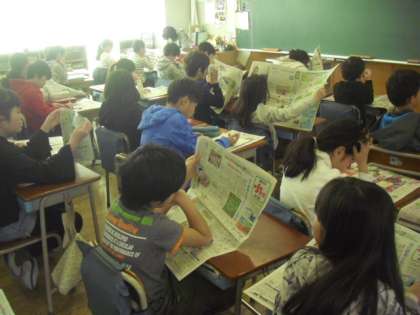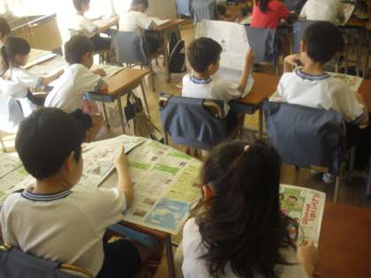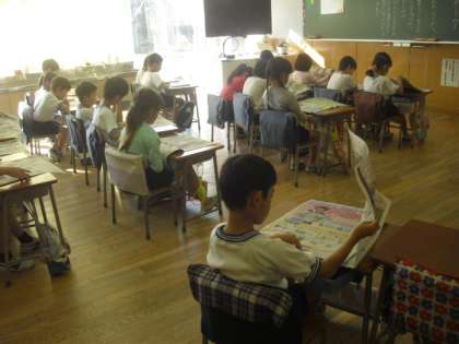 今年度から始まったNIEタイムも、今日が最終回。すっかり新聞にも慣れて、1年生の教室でも、みんな静かにページをめくって活字を追っていました。新聞を情報ソースとして活用し、子どもたちの活字離れを減らすのもねらいの一つです。毎月1回でしたが、どの学年もしっかり新聞のよさを感じながら、この1年間取り組むことができたようです。来年度も継続していく予定です。