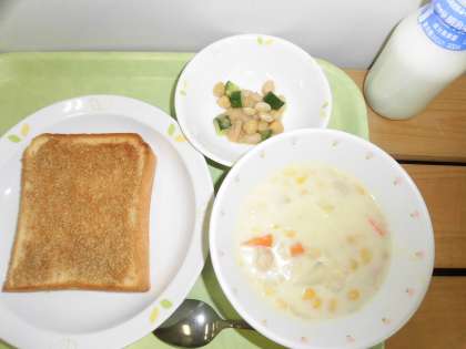 「きな粉バタートースト、クリームスープ、ビーンズサラダ、牛乳」です。