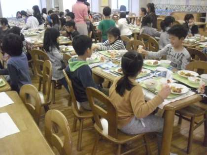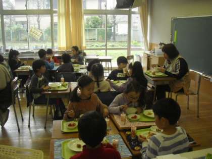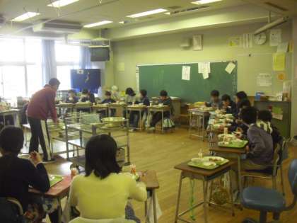 今日で、今年度の給食も最後になります。各クラスでは、いつもと席を変えるなどして、最後の給食を楽しみました。2年生は、学年でランチルーム給食でした。進級のお祝いのお赤飯をおいしくいただきましょう。
