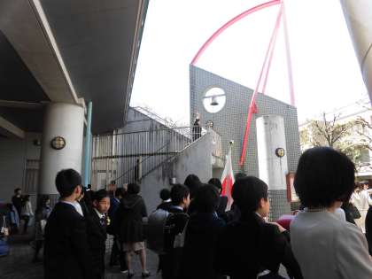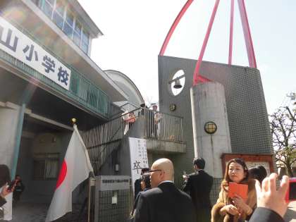 門送りの後は、恒例となっている、八幡山小学校の卒業式の鐘です。担任たちが正門の上に上がり、「卒業、おめでとう!」のかけ声と共に、鐘を鳴らします。大歓声の中、年に1度の鐘の音が、響き渡りました。その後は、思い思いに記念撮影。名残惜しさも手伝って、正門前にはいつまでも思い出に浸る卒業生たちの笑い声があふれていました。
