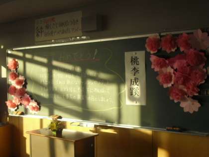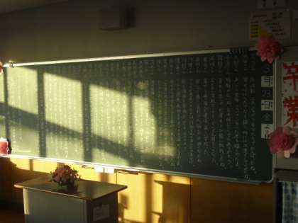 卒業式の後の教室です。それぞれに思い出の詰まった場所も、今はしーんと静まりかえっています。6年生の皆さんは、今日で八幡山小学校を卒業となりましたが、八幡山小学校が皆さんの母校であることは変わりません。いつでも遊びに来てくださいね。待っていますよ。また、5年生は、今日の卒業式で、6年生をしっかりと支えてくれました。ありがとう。4月からは、君たちが6年生として、八幡山小学校をリードしていきます。よろしくお願いしますね。