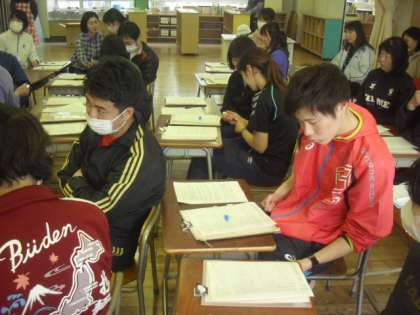 午後は教職員全員で、新年度を迎えるに当たってのアレルギー対応に関する研修を行いました。食物アレルギーによる、万が一を想定しての児童への対応について確認しました。アレルギーでアナフィラキシーを疑う症状が出た場合の、各先生方の役割、流れを確認しながら、実践的な訓練になりました。エピペンの使い方についても、練習用の器具を使ってグループで演習しました。