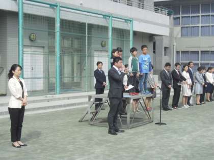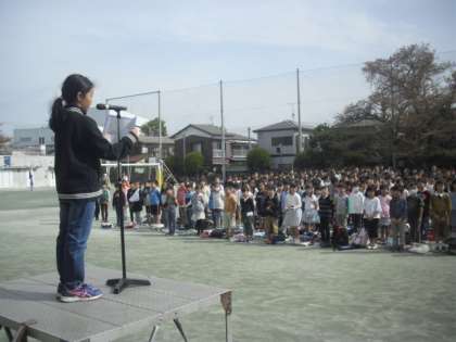 担任の先生が紹介され、どの学年の子どもたちも笑顔で、気持ちも新たに1年をスタートすることができたようです。児童の代表の言葉では、4年生と6年生の代表児童が、新学期への意気込みを述べてくれました。新たに転校生も5人加わり、総勢453名で、八幡山小学校の平成30年度が始まりました。
