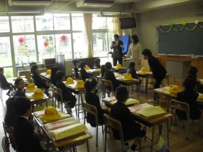 教室では少し緊張気味の1年生が、じっと座って待っていました。6年生がやさしく声をかけ、緊張をほぐしています。