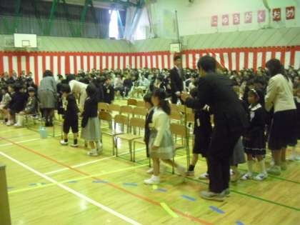 午前10時30分、いよいよ72名の新1年生の入場です。たくさんのお客さんの前で、笑顔で元気に入場することができました。