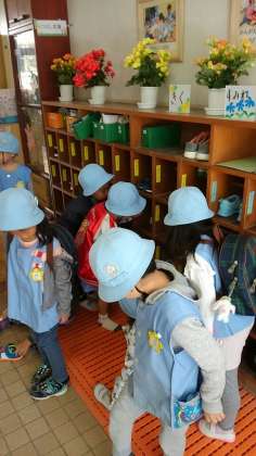 春休みを楽しく過ごしてきた元気な年長さんです。ばら組はきく組に、もも組はすみれ組にそれぞれ進級し、下駄箱も教室も変わりました。毎日2階の保育室で過ごすようになります。