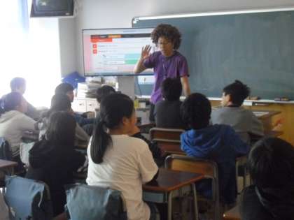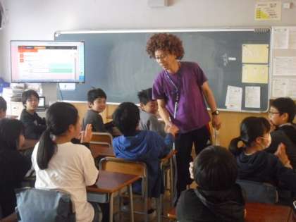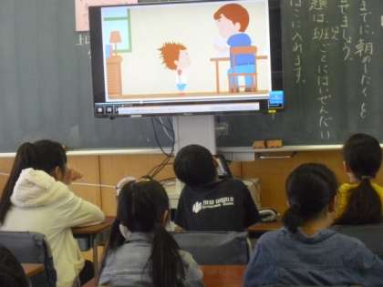 今年から、火曜日と金曜日の朝の時間は、15分間のモジュール授業が行われます。高学年の教室では、DVDの映像と音声を使っての外国語活動です。第1回目の今朝は、それぞれの教室で担任の先生が導入を工夫しながら、楽しく英語に親しむために奮闘していました。子どもたちも笑顔で授業に参加し、興味をもって活動に取り組んでいました。