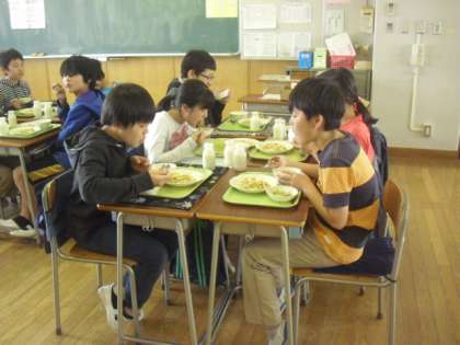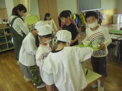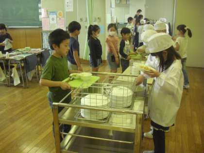 今日からみんなが楽しみにしていた給食がスタートしました。クラスで給食の約束事を決めて、みんなで協力して配食です。新しい友達と食べる最初の給食。おいしくいただきましょう。