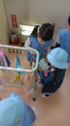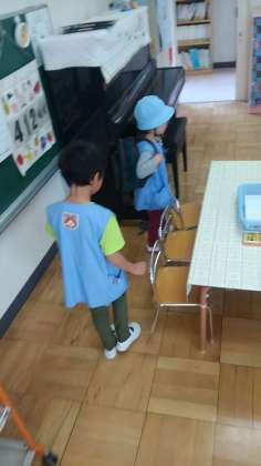リュックをロッカーにしまい、タオルやコップをハンガーにかけて、手洗いうがいをします。「そうそう、完璧!」「ごしごししてね。」と年長さんの成長を感じます。