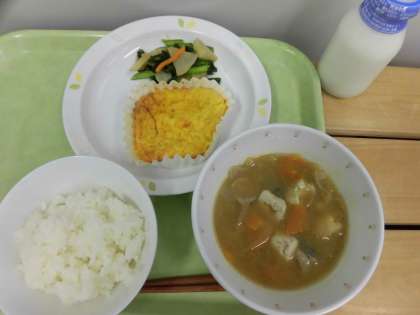 「ごはん、卵焼き、野菜のおかかかけ、豚汁、牛乳」です。