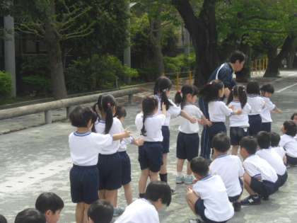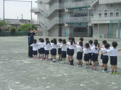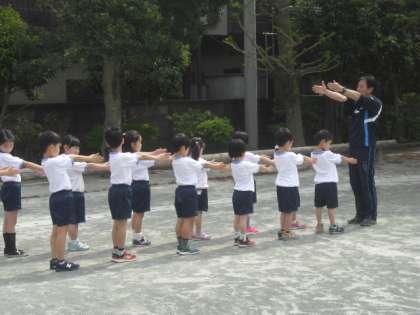 天気のよい校庭では、1年1組が初めての体育の授業。今日は、整列の仕方として「前へならえ」のやり方を教わり、素早い集合の練習を繰り返し行いました。上手に並べるようになるために、今日教わったことをしっかり覚えてくださいね。