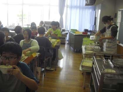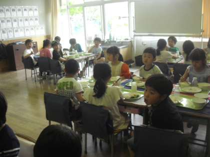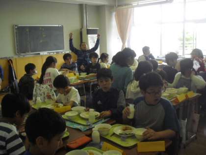 今日も大好きな給食の時間。どの学年もしっかり食べて、午後の勉強に備えます。高学年には、栄養士の阿久津さんがおかわりを持ってきてくれて大喜び。しっかりお礼も言うことができ、元気いっぱいです。