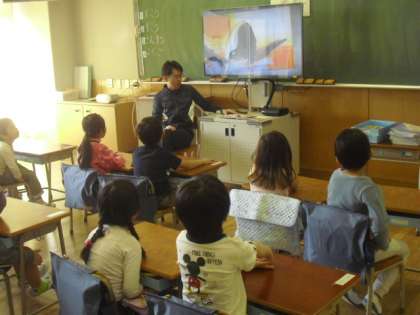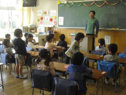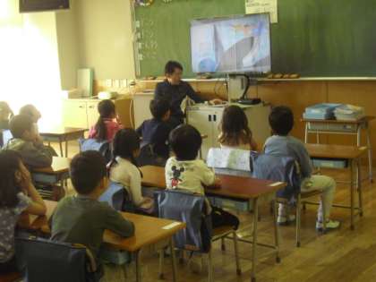 朝の学級の時間。1年生の教室では、それぞれの担任の先生によって有意義に過ごします。2組では絵本をモニターに映しての読み聞かせをしました。子どもたちは食い入るようにして、先生のお話を聞いていました。1組では、朝のあいさつを徹底する指導です。きちんとお話を聞くことを大事に、繰り返し指導が続けられました。こうして1年生は、先生からいろいろなことを学んでいます。
