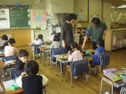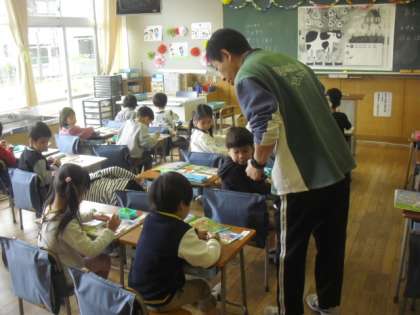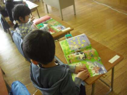 1年生も教科書を使っての授業が始まりました。1組では、算数で数の勉強をおはじきを使って取り組みました。補助の先生にも手伝ってもらって、しっかり数えることができていました。
