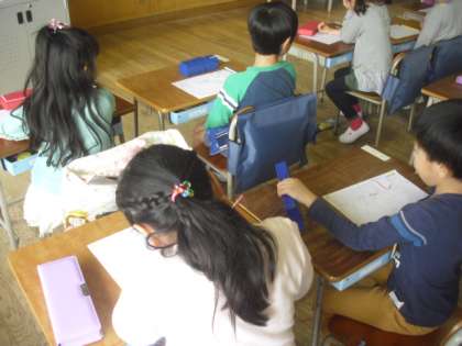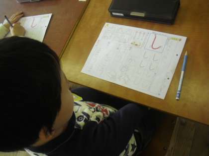 1年生の教室では、ひらがなの勉強が始まっています。今日はワークシートを使って、「し」の文字の練習をしました。きれいな字を書くために、姿勢を正して集中します。全員がしっかり書くことができ、先生からハナマルをもらって嬉しそうでした。