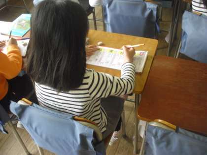 2組の教室では、3年生で新しく習う漢字の勉強を、漢字ドリルを使って練習しました。ただ文字をなぞるだけでなく、お手本をよく見ながら、姿勢も正してていねいに練習することが大事です。字の練習だけでなく、漢字を使った熟語や短文の練習もして、使い方もしっかりマスターしていきましょうね。