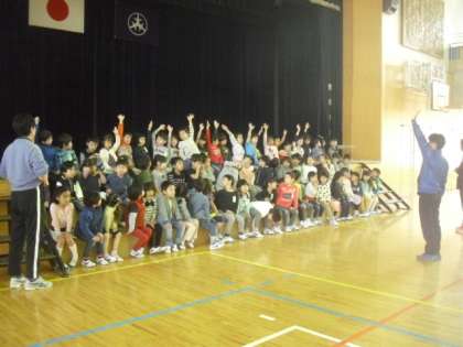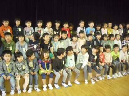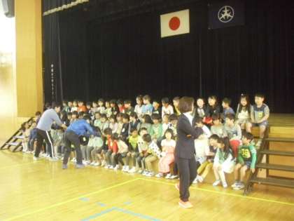来週の水曜日に行われる「1年生を迎える会」の練習を、1年生が学年で行いました。全校児童の前で入場・整列するために、会の流れと自分の並び順を覚えます。体育館に設置されたひな壇に座り、先生の説明を聞く1年生の様子から、来週の会を楽しみにしていることがうかがえました。