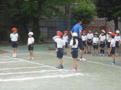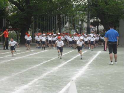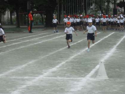 2年生の3時間目は、学年合同での体育の授業。校庭で50m走のタイムを計測しました。まずは、並び方や整列の仕方を教わり、1回ずつスタートの練習をしました。本番のタイムトライアルでは、みんな一生懸命に腕を振り、全力で50mを走り切っていました。
