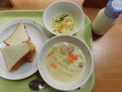 「ジャムサンド、コーンシチュー、フレンチサラダ、牛乳」です。
