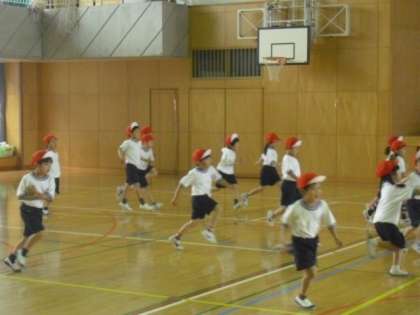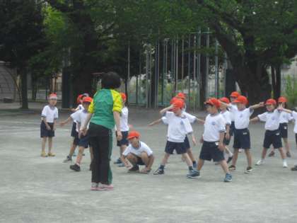 今日も気持ちのよい青空の中で、1年生が体育の授業に臨んでいました。校庭では、1組と3組が、場所を分けて活動していました。2組は体育館での授業でした。どのクラスもみんなで楽しく身体を動かす活動が行われ、笑顔いっぱいで授業に参加していました。