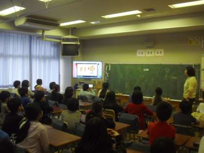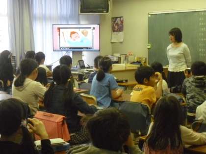 火曜日は高学年で、外国語活動のモジュールの時間です。今朝は、6年生が学力テストなので、5年生だけで行われました。子どもたちは、DVDの映像にも慣れて、リズムに乗って発音練習をしていました。