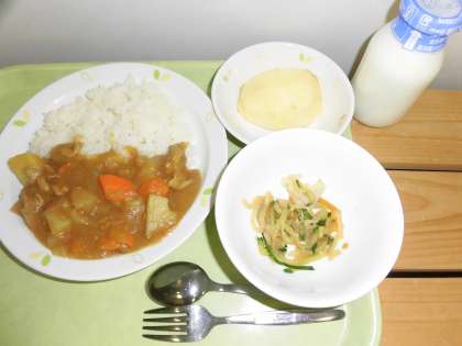 「カレーライス、シャキシャキ野菜、りんご、牛乳」です。