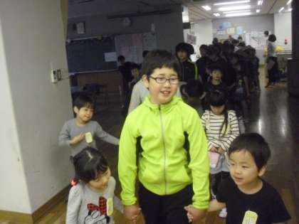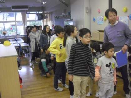 1年生の入学式から、今日でちょうど10日目。今年最初の集会は、1年生を迎えて初めて全校児童がそろう集まりです。朝から6年生は1年生の教室に行き、いつものようにお世話をした上で、集会のためにオープンスペースに並んで、1年生と手をつないで入場を待ちます。