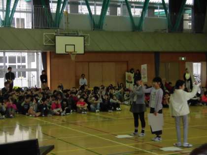 先生紹介では、担任の先生をはじめとして、1年生に関係する先生たちが登場しました。その後は、代表委員が考えた学校に関するクイズで盛り上がりました。