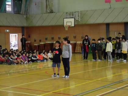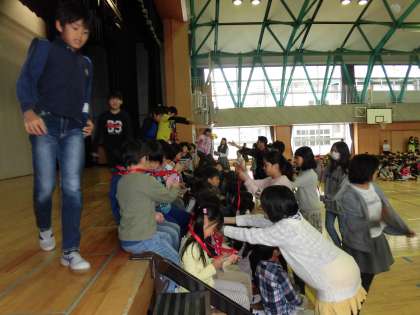 次に入学をお祝いして、1年生へのプレゼントです。6年生が心を込めて作ったメダルです。裏には校歌の歌詞が書かれています。1年生一人ひとりの首にかけられ、とても嬉しそうでした。