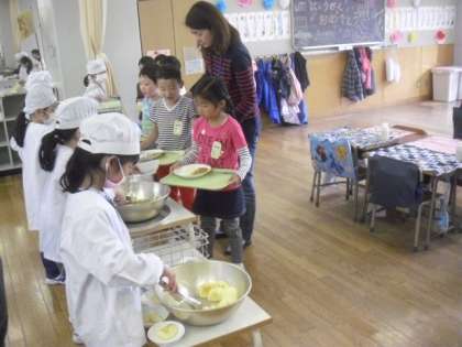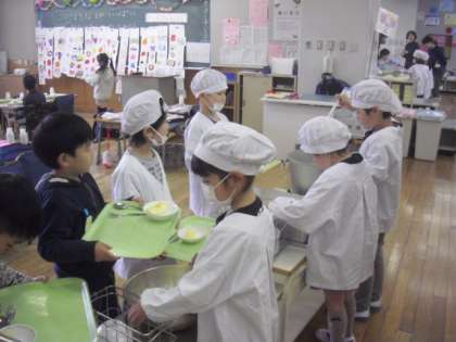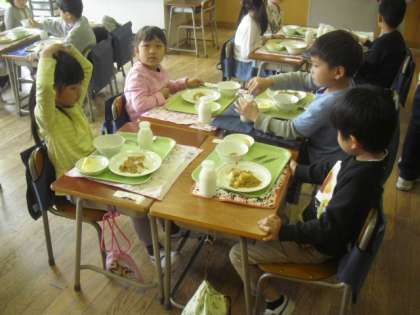 今日の給食は、みんなの大好きなカレーライスです。1年生も八幡山小で食べる初めてのカレーライスが楽しみだったようで、準備もみんなで協力して一生懸命やっていました。さあ、みんなそろって、おいしくいただきましょう。
