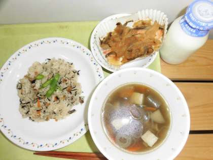 「ひじきごはん、鮭のチャンチャン焼き、けんちん汁、牛乳」です。