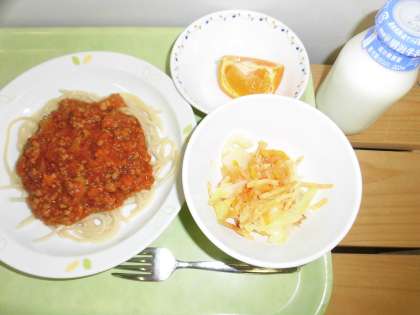 「スパゲティミートソース、じゃが芋のハニーサラダ、カラマンダリン、牛乳」です。