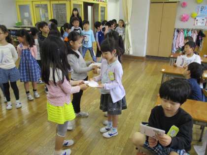 今週の金曜日に学校探検があります。今日は、2年生の児童が、1年生のみんなに招待状を持ってきてくれました。招待状をもらった子は、うれしそうに招待状を読んでいました。2年生の皆さん、よろしくお願いします。