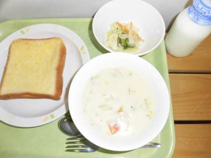 「ガーリックトースト、クラムチャウダー、ごぼうチップサラダ、牛乳」です。