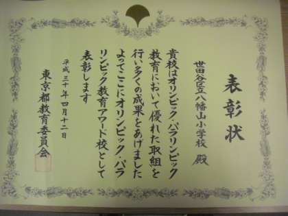 八幡山小学校は、今年度もオリンピック・パラリンピック教育アワード校に指定されました。これまでのさまざまなオリ・パラ教育の活動や取組が評価され、今年も東京都教育委員会より表彰されました。これからもアワード校として、子どもたちの体力向上やオリンピック・パラリンピック教育の推進を進めていきます。