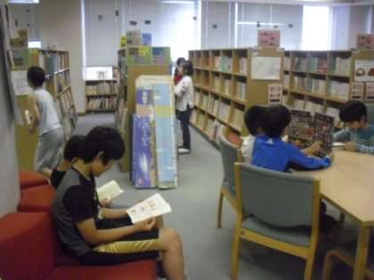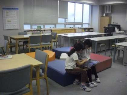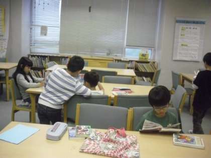 雨降りの休み時間は、図書室が大盛況です。2時間目が終わるや否や、本好きの子どもたちが図書室に駆け込んで、思い思いに本を楽しむ姿が見られました。仲のよい友達同士で1冊の本を読み合っている様子も見られ、それぞれに本の世界に浸っていました。