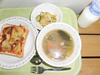 「ピザトースト、田舎風スープ、イタリアンサラダ、牛乳」です。