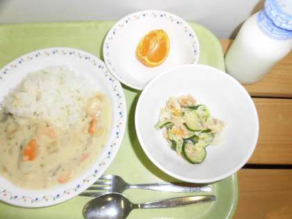 「シチューごはん、ツナサラダ、マンダリンオレンジ、牛乳」です。