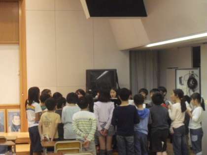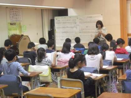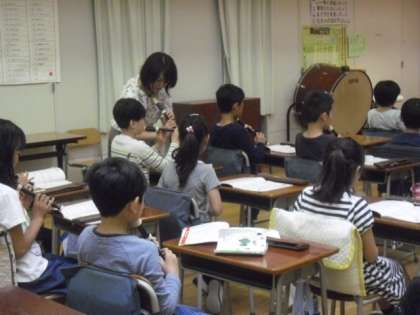 4年1組の4時間目は、音楽の授業。「ビリーヴ」の歌の練習と、リコーダーの練習が行われました。先生や友達の歌声をお互いに聞き合うために、先生の伴奏するピアノの近くに集まって歌いました。リコーダーは、運指を確認しながら音色に気をつけて吹きます。小山先生が一人一人に声をかけながら、子どもたちは一生懸命に練習に励んでいました。