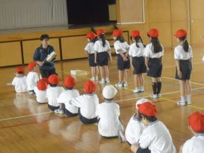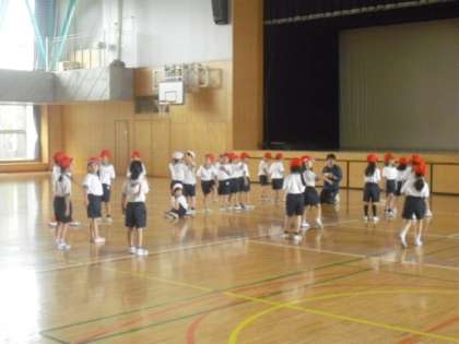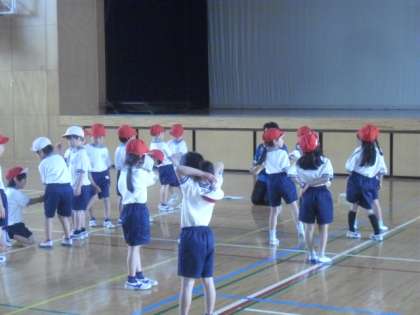 1年2組では、3時間目に体育館での体育の授業が行われました。担任の先生の太鼓の合図で、いろいろな形に整列します。先生の指示をしっかり聞いて、子どもたちは素早く行動していました。雨の日でもしっかり身体を動かすことができました。