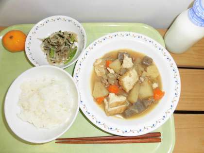 「ごはん、五目旨煮、野菜の乾物和え、冷凍みかん、牛乳」です。