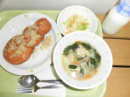 「白ごま揚げパン、肉団子スープ、キャベツサラダ、牛乳」です。